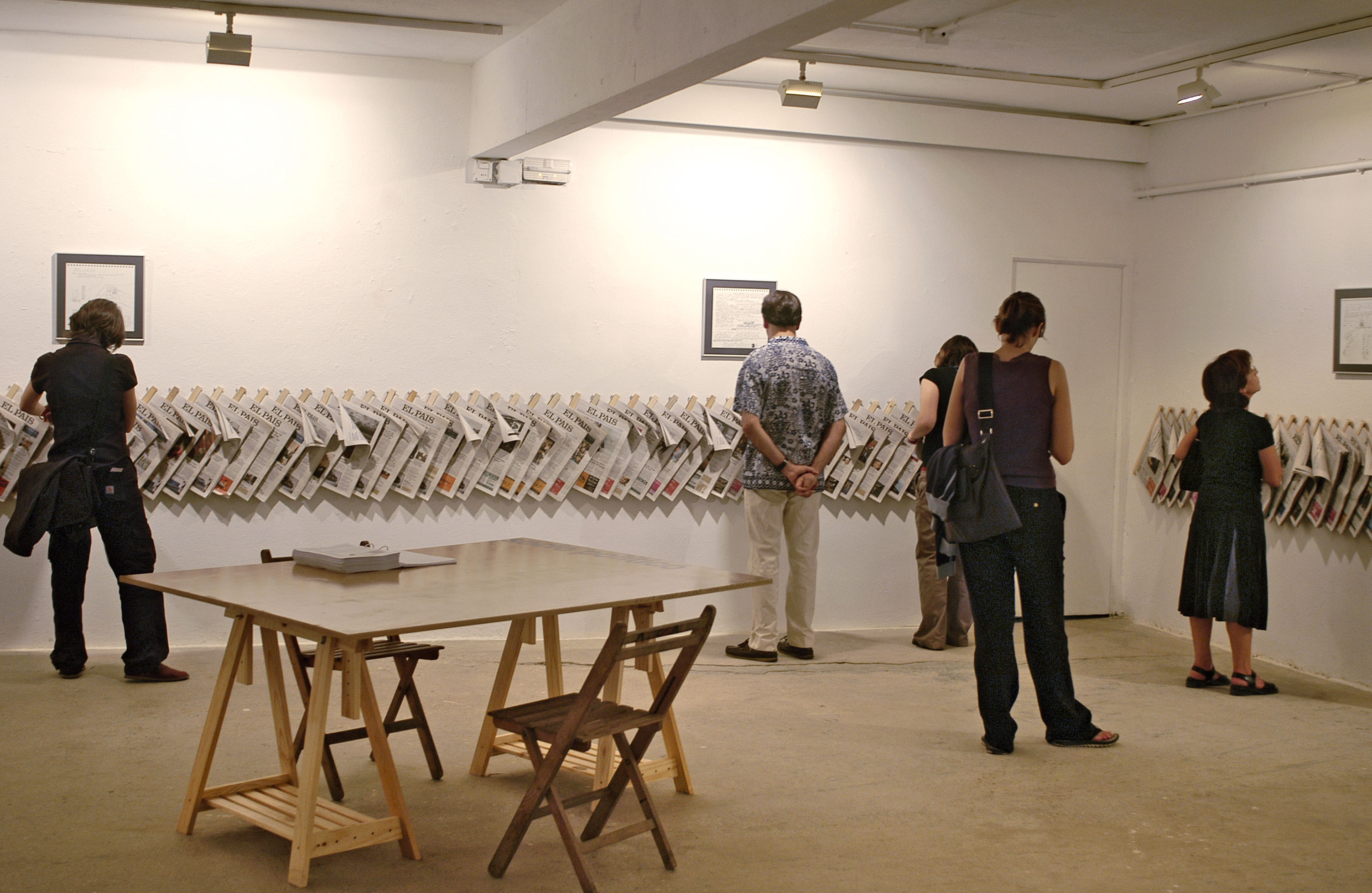 compuesto por 363 periódicos, 3 mesas, 6 sillas, 1 mostrador, 1 probador, 8